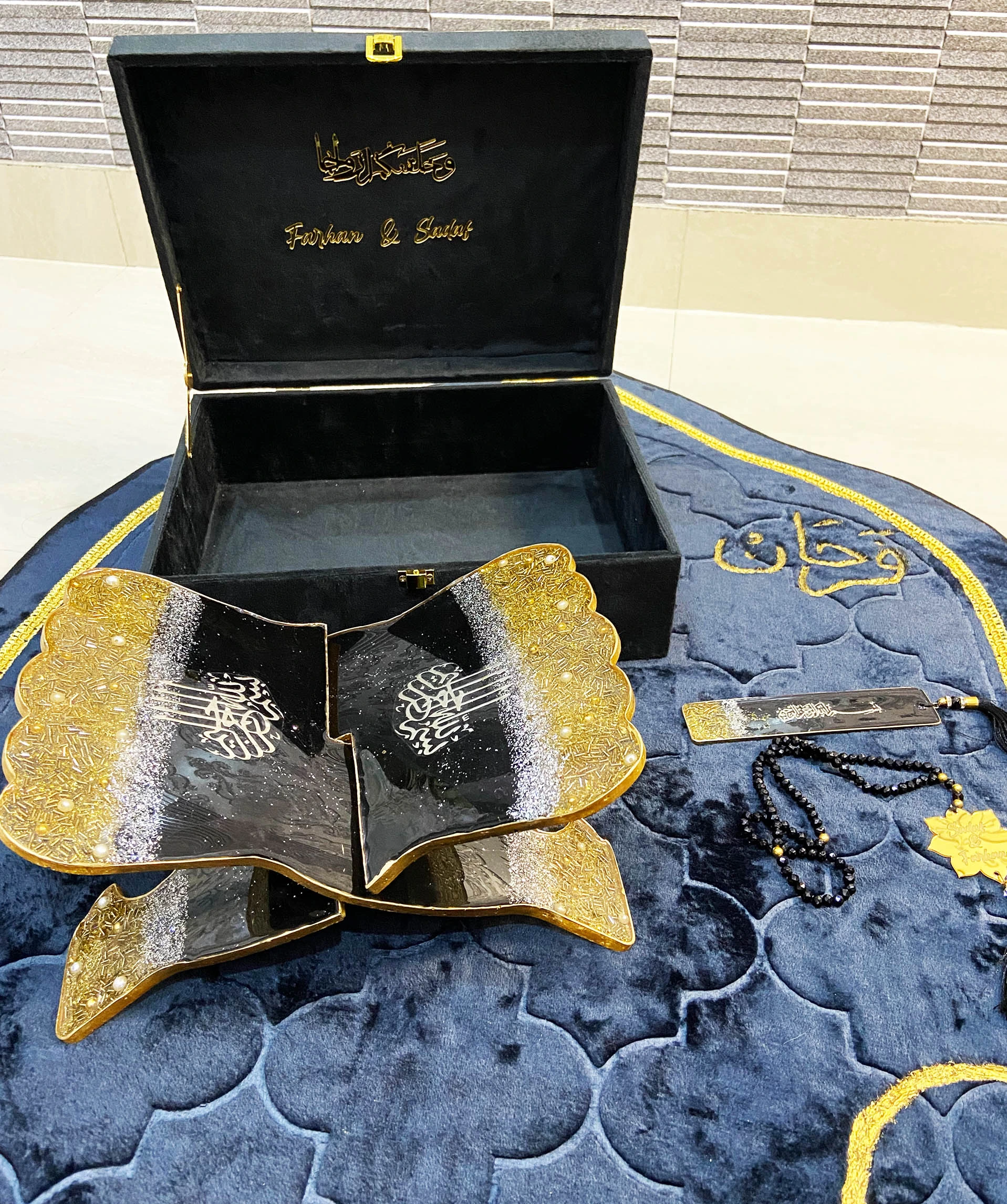 🎁 Designer Box – Wrapped in luxurious velvet and topped with handcrafted resin featuring Bismillah for a majestic finish