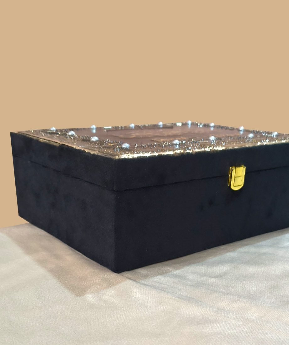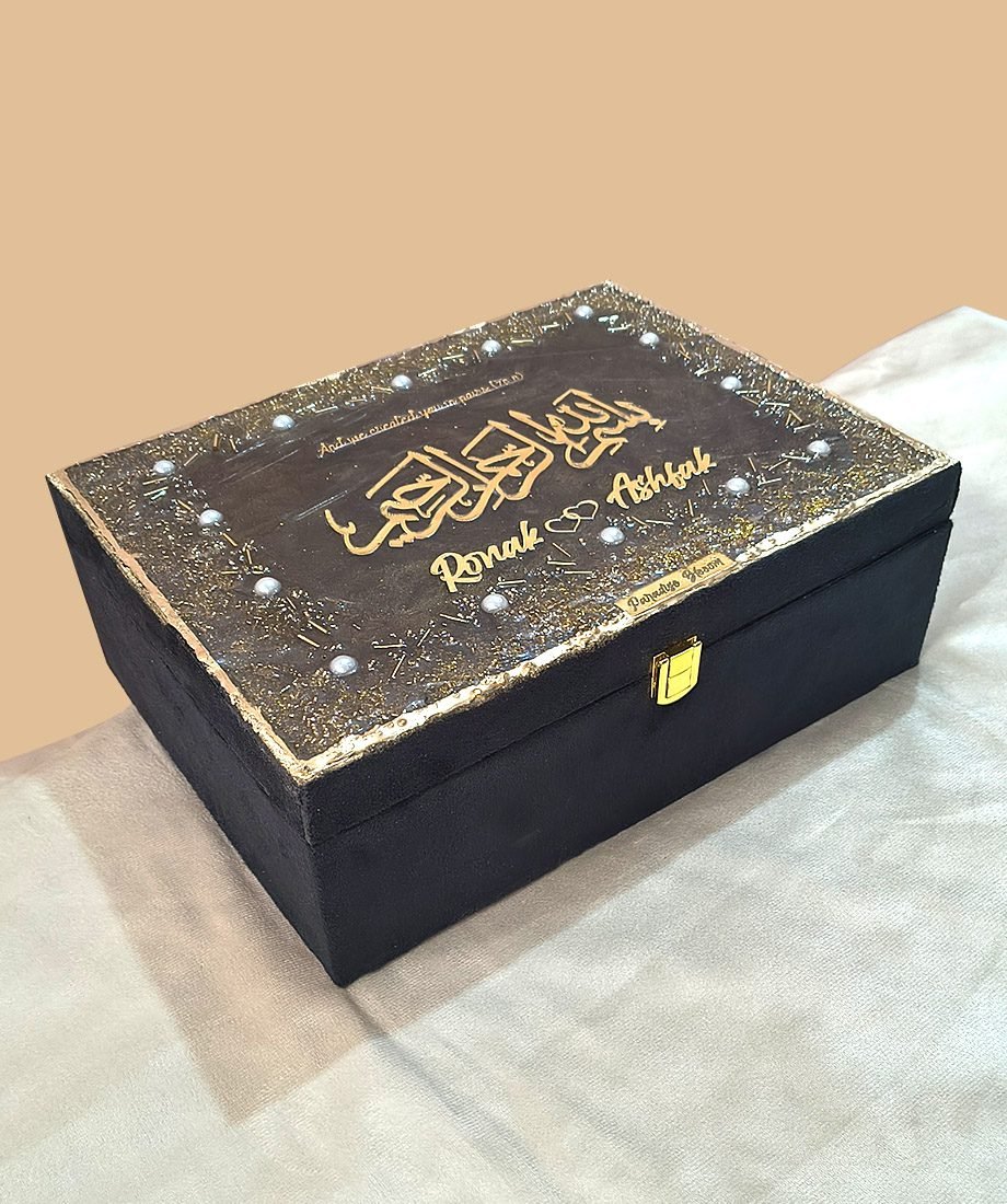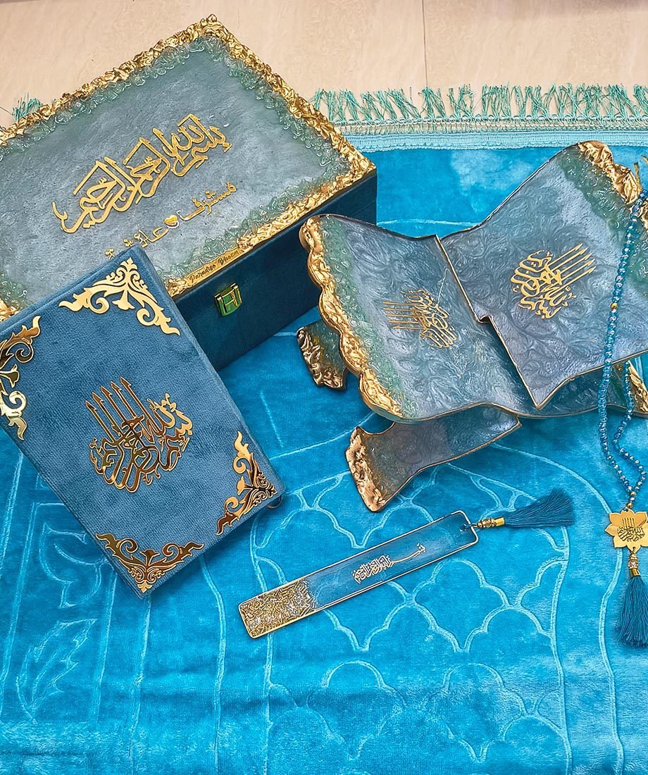 This Premium Designer Quran Box is thoughtfully handcrafted to hold your sacred items with deep care and meaning. Wrapped in rich, soft-touch fabric and crowned with a striking resin Bismillah artwork, it’s more than just a box — it’s a personal sanctuary of devotion.