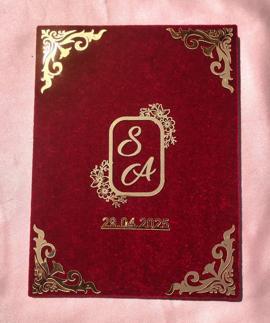 Wrapped in rich, premium velvet, the cover exudes softness and sophistication, while the intricate design details add an elegant charm that reflects the sacredness of the occasion. The highlight — your personalized names delicately placed on the cover — makes this booklet a one-of-a-kind treasure, made just for you.