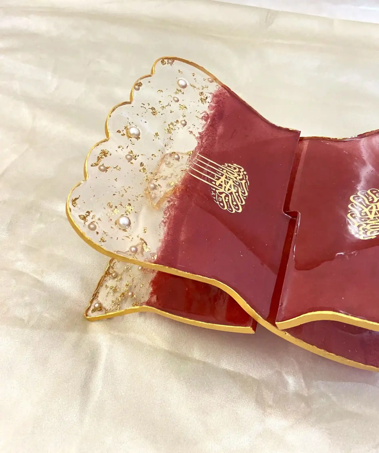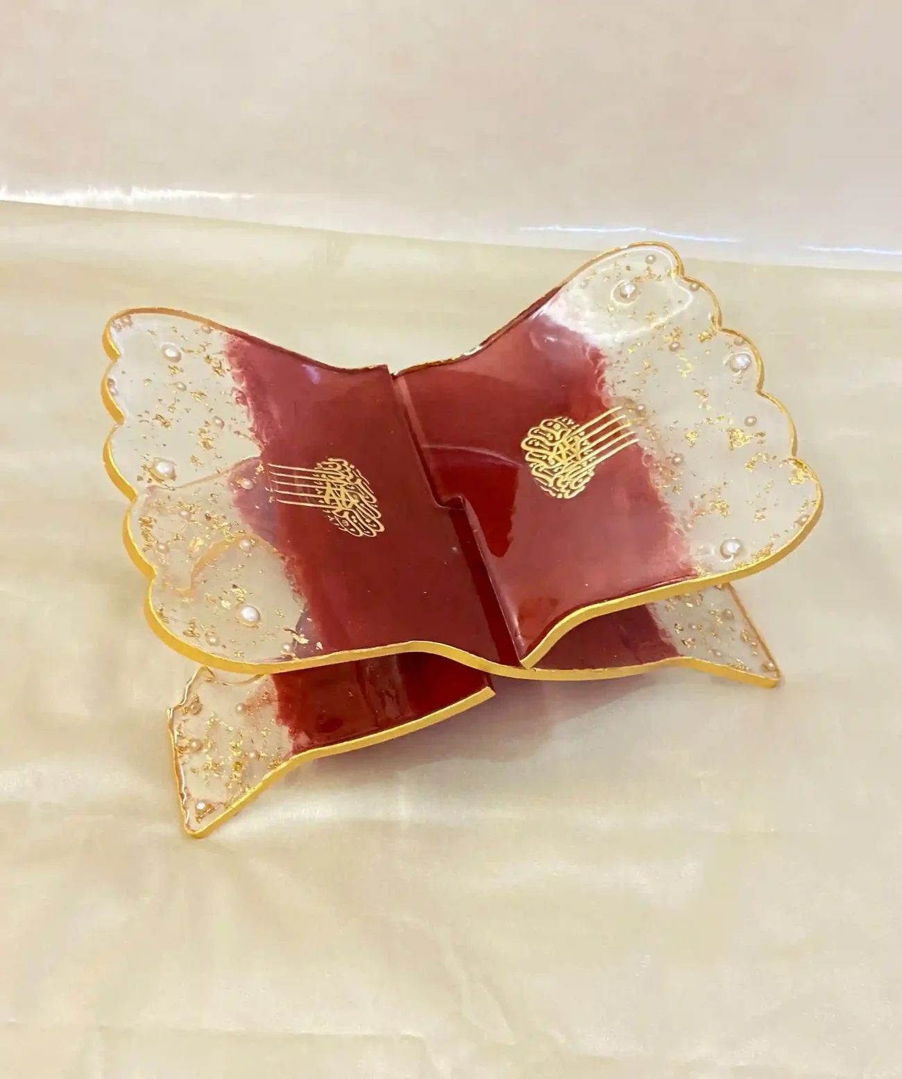 Each Rehal is lovingly poured and crafted by hand, using high-quality, durable resin — ensuring clarity, strength, and a stunning glass-like finish. Delicate accents like gold flakes, floral elements, or butterflies are added within the layers, making every piece unique and deeply meaningful.