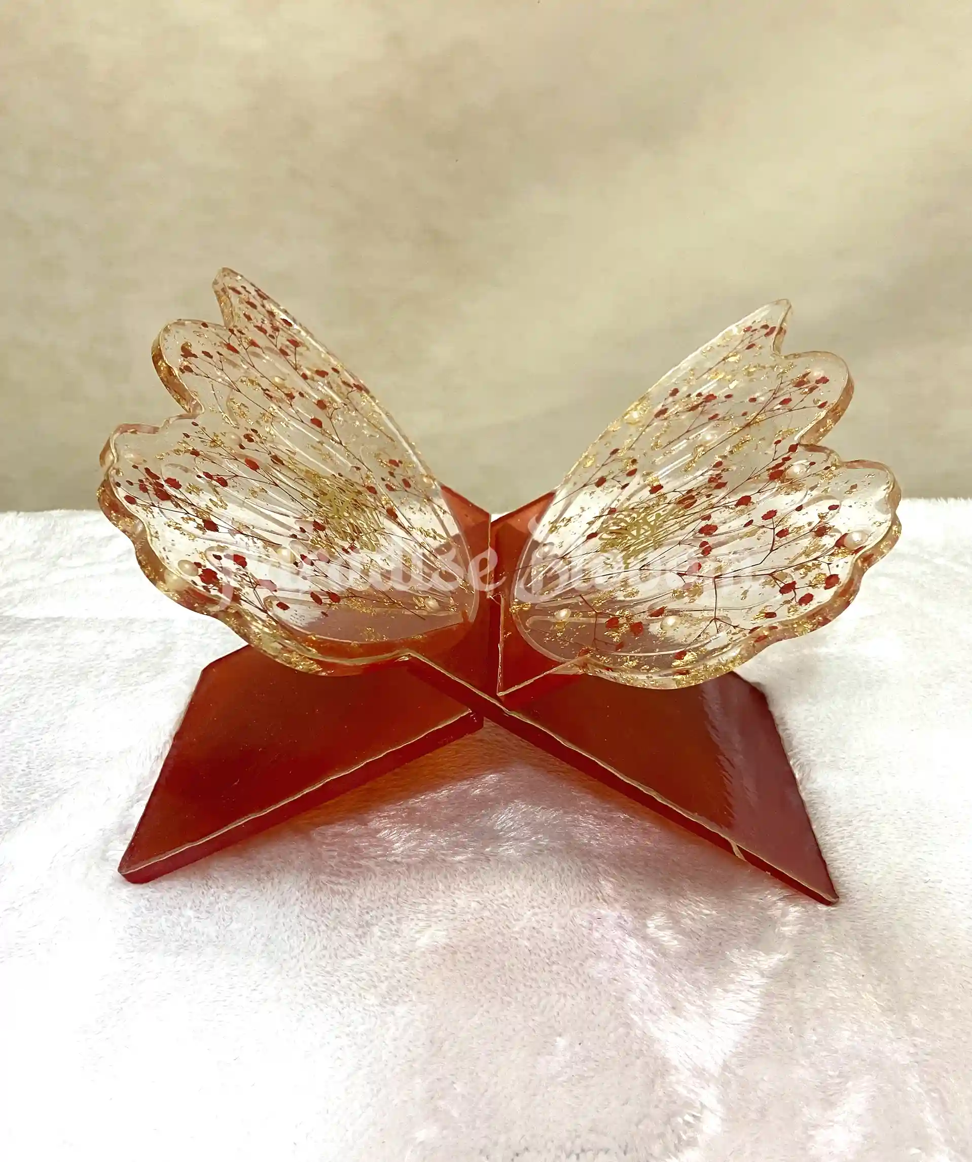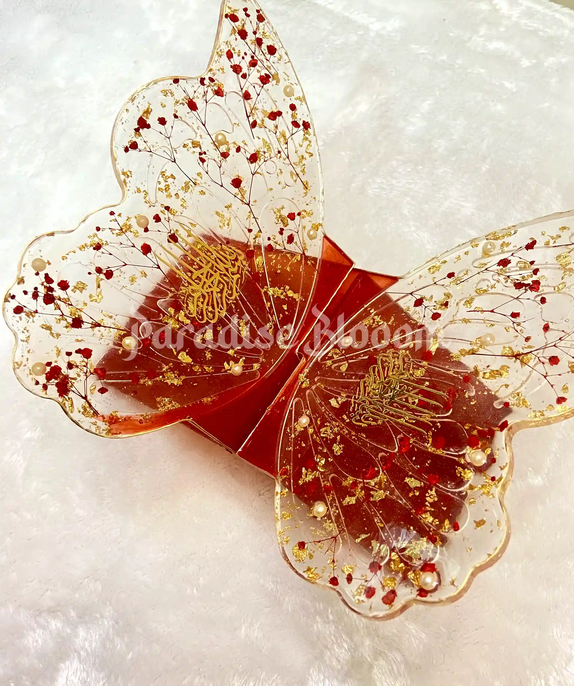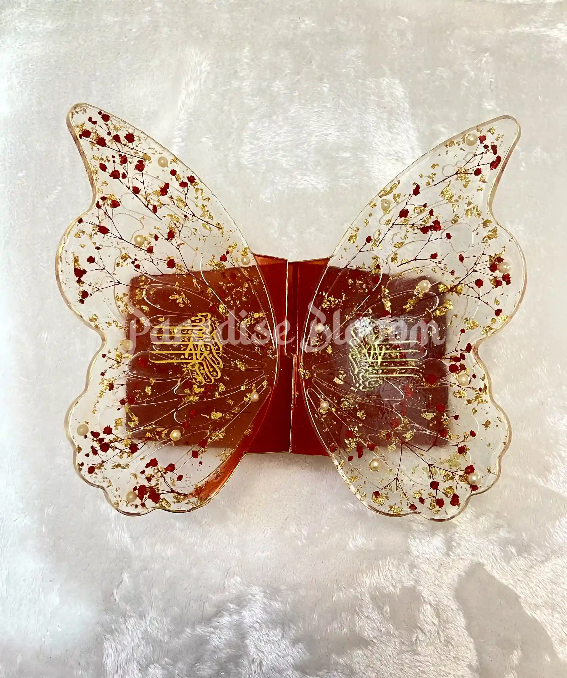 Each Rehal is lovingly poured and crafted by hand, using high-quality, durable resin — ensuring clarity, strength, and a stunning glass-like finish. Delicate accents like gold flakes, floral elements, or butterflies are added within the layers, making every piece unique and deeply meaningful.