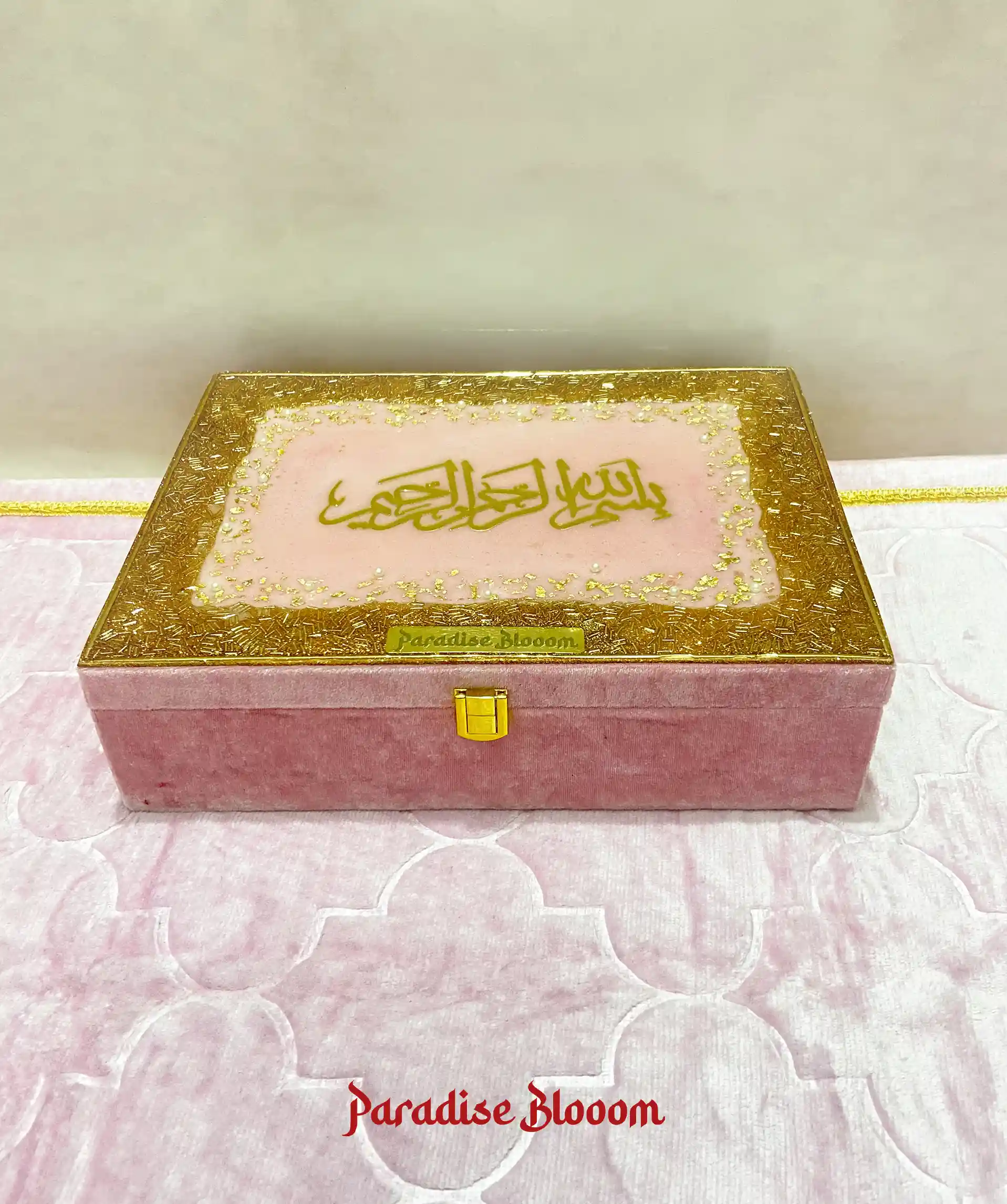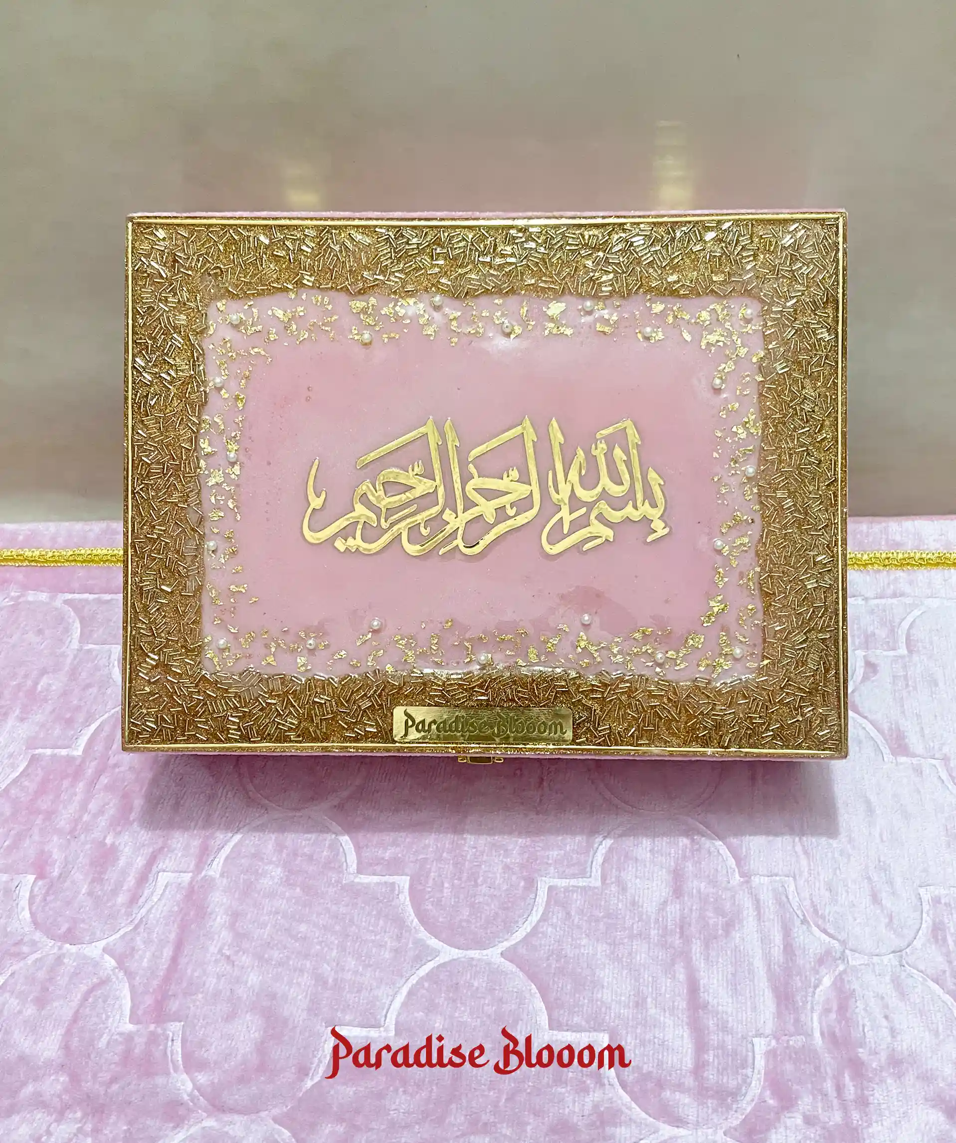 This Premium Designer Quran Box is thoughtfully handcrafted to hold your sacred items with deep care and meaning. Wrapped in rich, soft-touch fabric and crowned with a striking resin Bismillah artwork, it’s more than just a box — it’s a personal sanctuary of devotion.